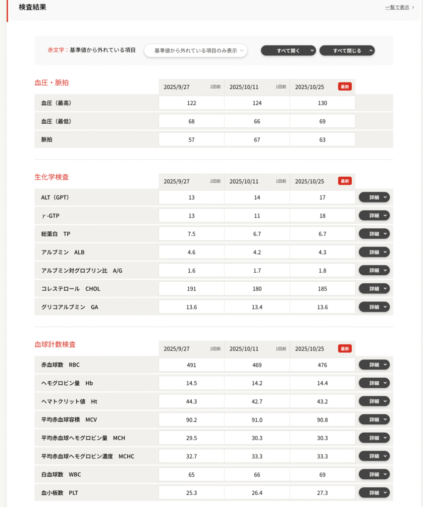 γ-GTP … 肝臓や胆道系の健康を表す指標。13 → 11 → 18 と変化したが、飲酒や脂肪肝がなければ問題なし。代謝活動の活性化による上昇と考えられる。