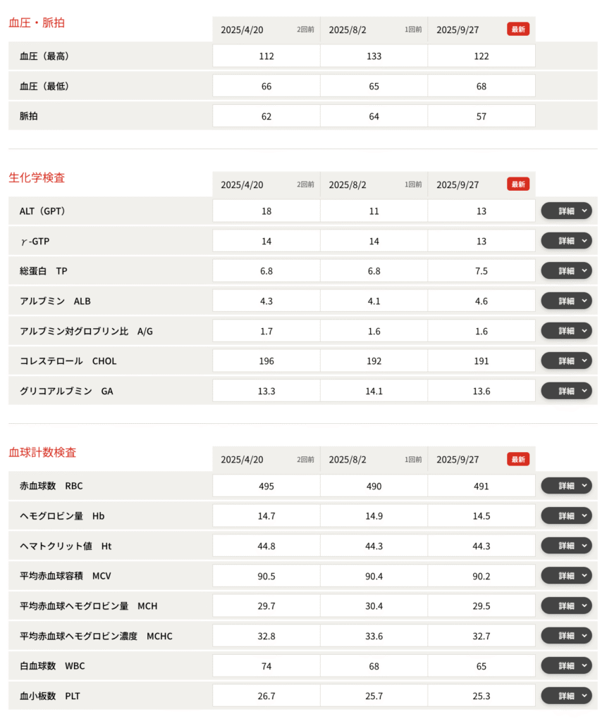 • アルブミン(ALB) … 栄養状態を表す代表的なタンパク質。低下すると疲れやすくなる。今回は 4.1 → 4.6 と改善。